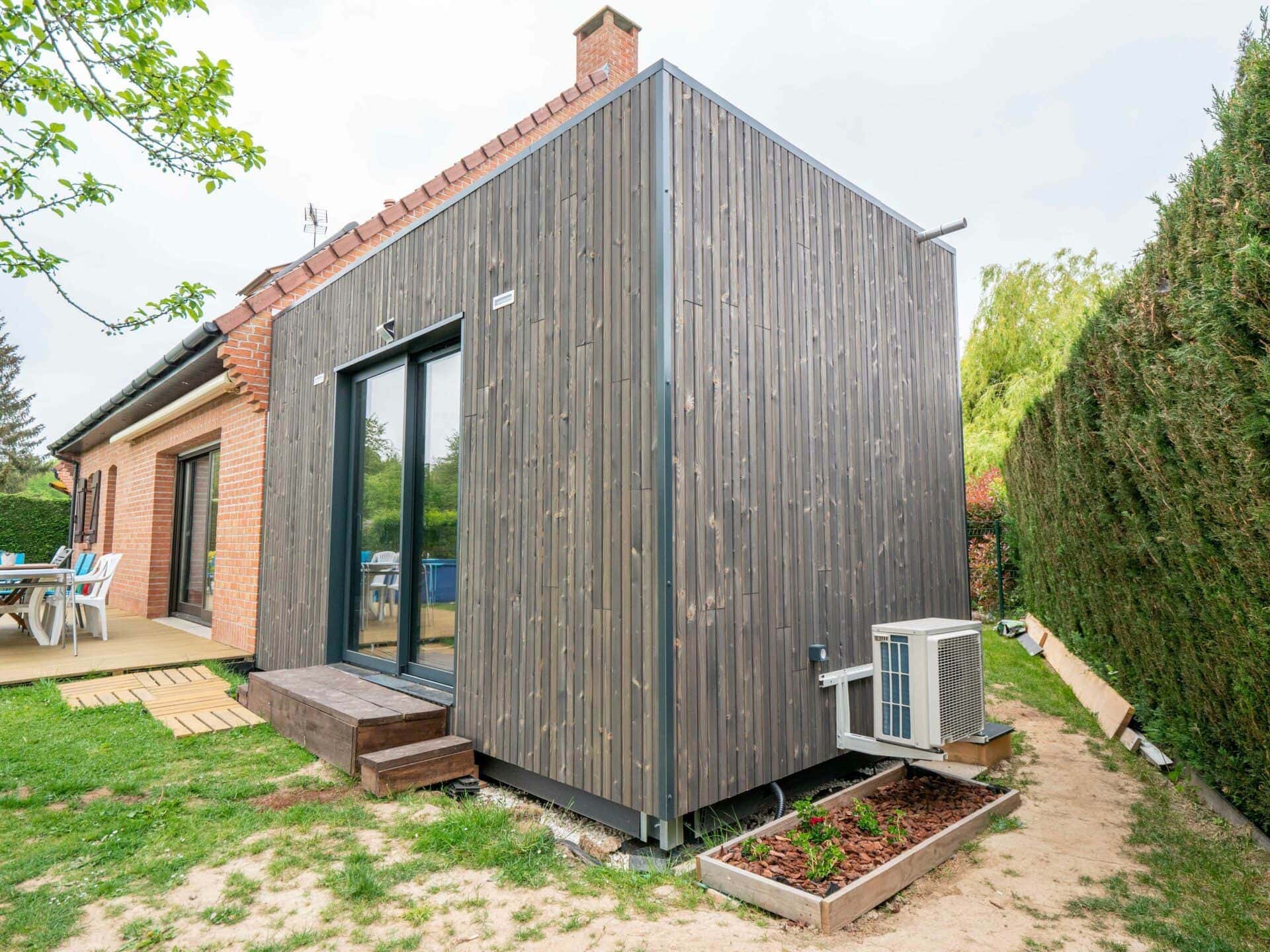 Le client, qui travaille dans l’industrie et la qualité, était exigeant sur la qualité du produit. Il a été conquis par les produits Natibox et les prestations (menuiseries en aluminium, WC suspendu, douche italienne), avec en prime un prix raisonnable ! Grégory a choisi le bureau de jardin de 15m², qu’il a accolé à sa maison.