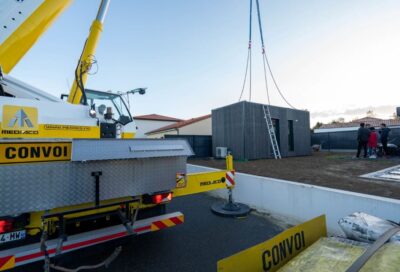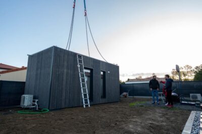 La pose s’est très bien passée. J’ai même participé à l’élingage de la box. Le camion et la grue sont arrivés dès 8 h et à 9h, 9h30, tout était fini. La box était posée. Prête à vivre.