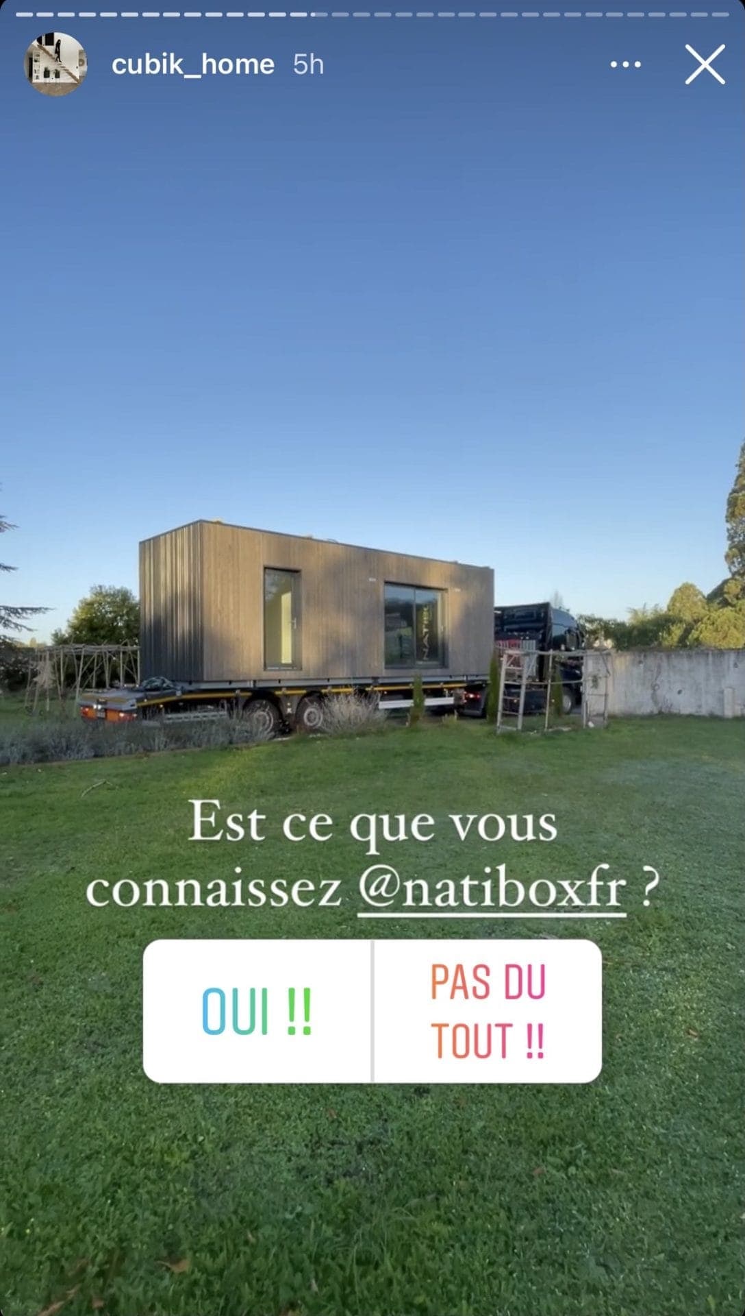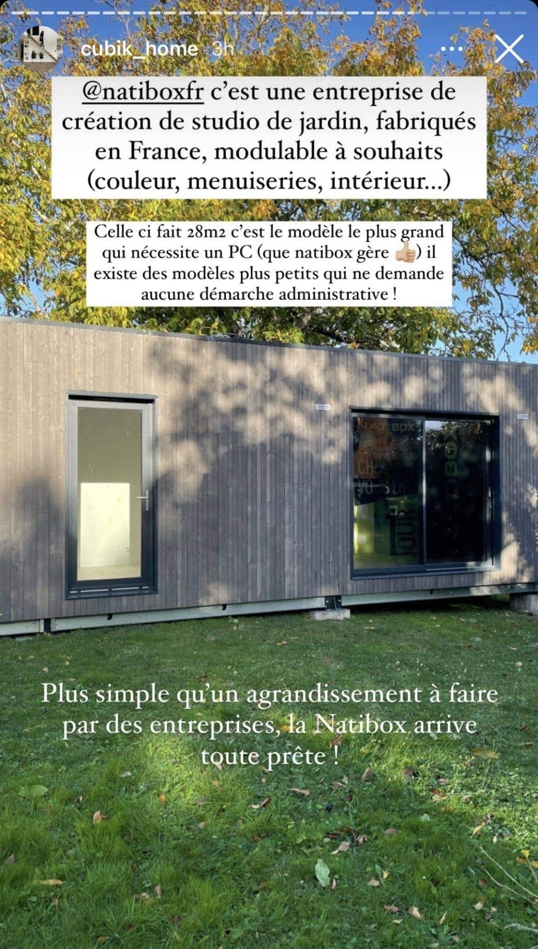 Cubik_Home a également partagé à sa communauté Instagram un Réel, qui reprend toutes les étapes de la pose du studio de jardin. Merci à elle pour ces contenus de qualité, qui a apporté une belle visibilité à Natibox !