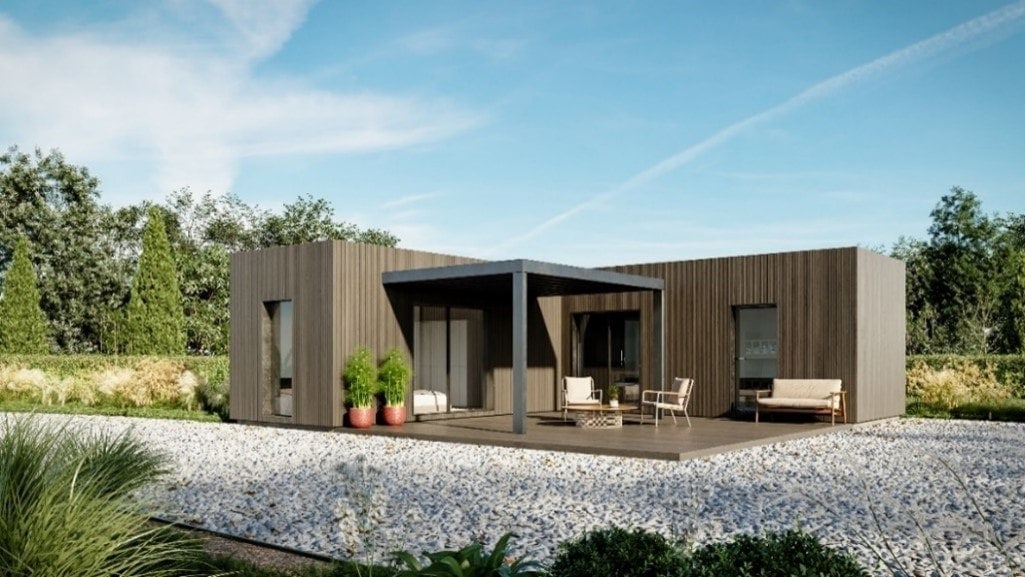 Cette mini maison en forme de L vous permettra de gagner 3 pièces de vie supplémentaires dans votre jardin ou sur votre terrain.
