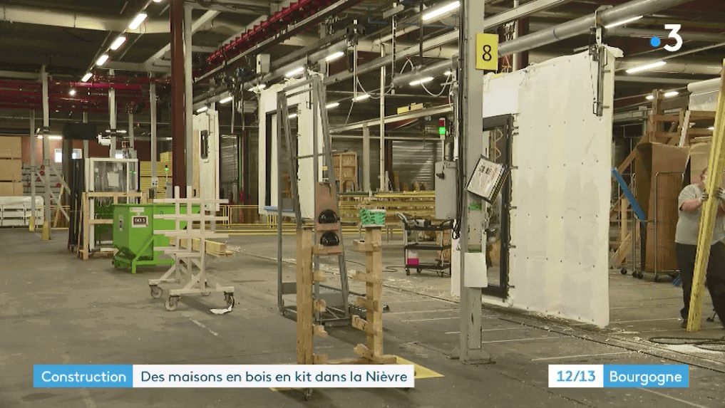 Depuis une vingtaine d’année, l’usine POBI – basée à la Charité-sur-Loire – produit des éléments de maisons individuelles (comme les murs en ossature bois et la charpente), pour ensuite les assembler directement sur le terrain du client en quelques heures. L’usine conçoit entre 3 et 4 maisons par jour grâce à un process de fabrication bien défini et industrialisé.