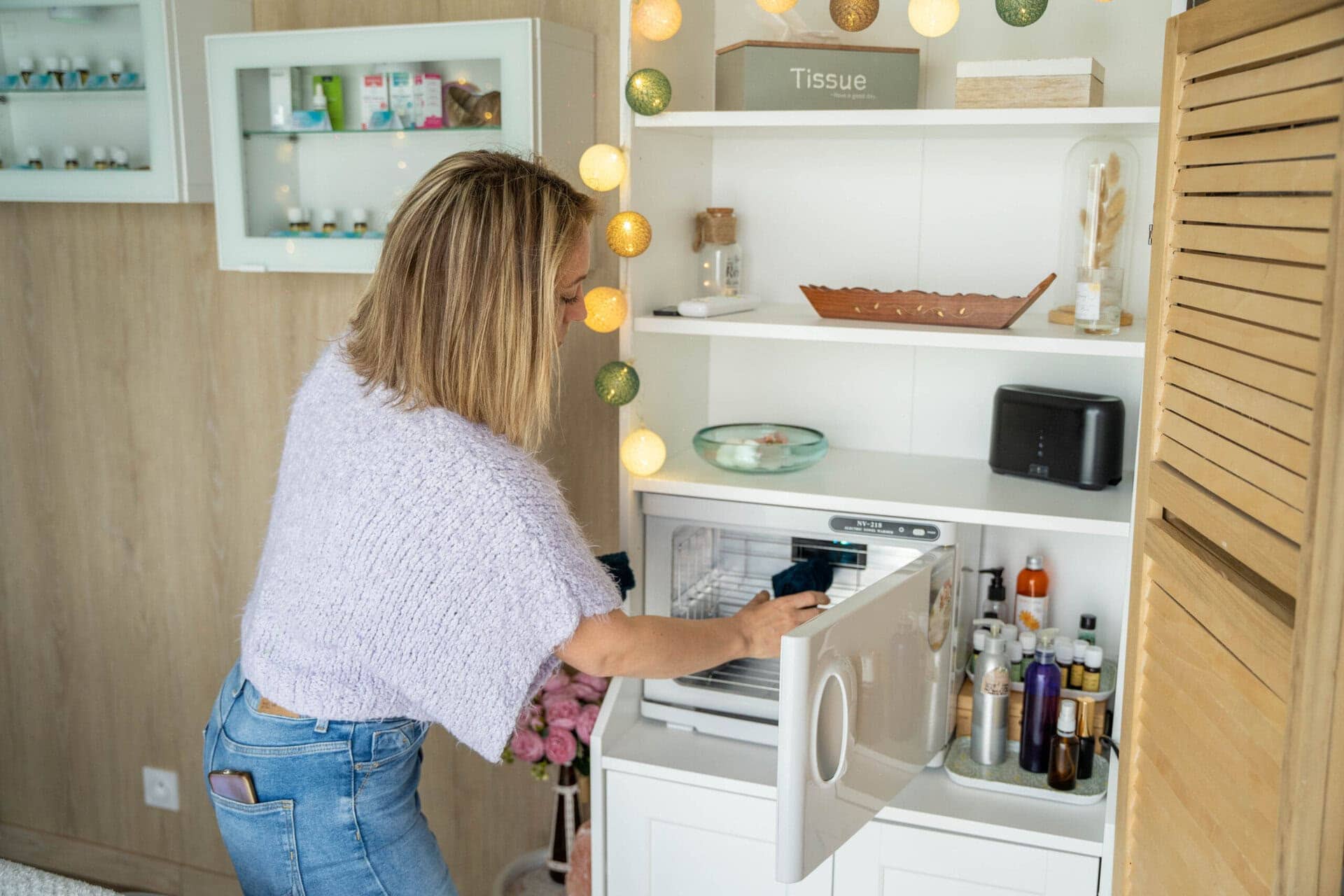 Installée en Essonne, Valérie a transformé sa Natibox en cabinet de soins chaleureux et apaisant, pour recevoir ses clients dans un environnement propice à la détente.