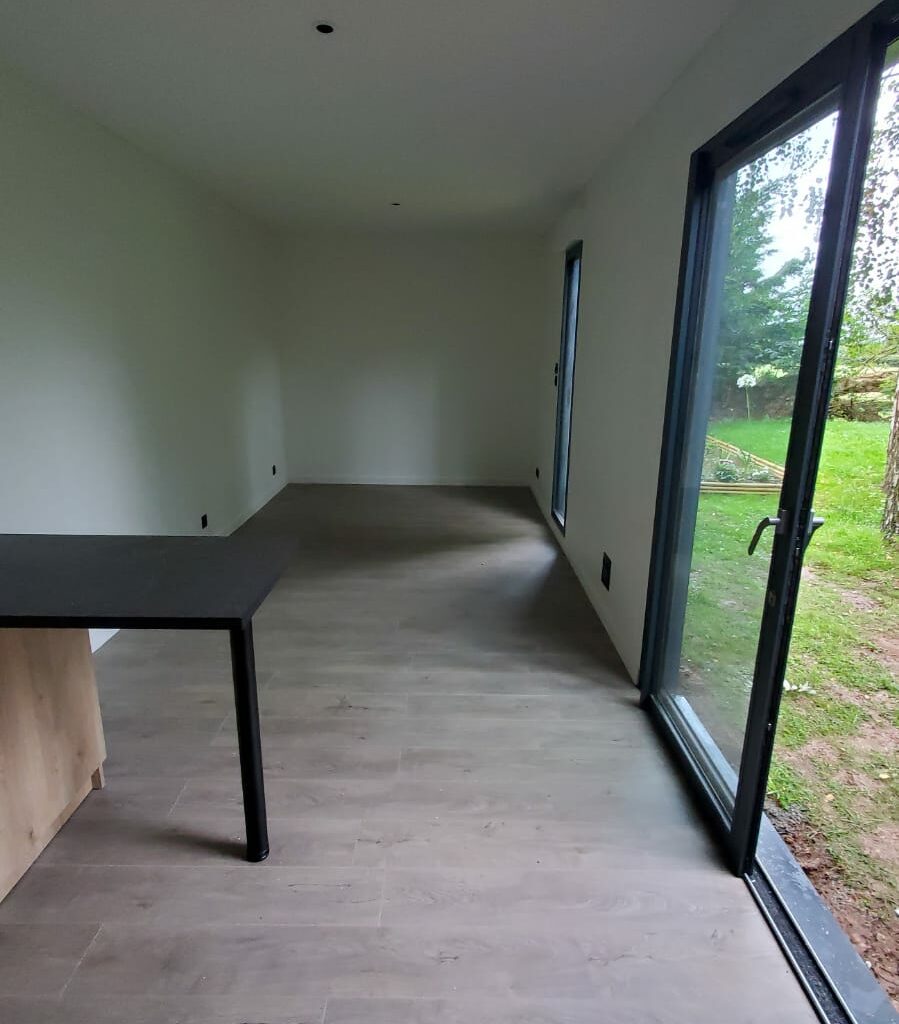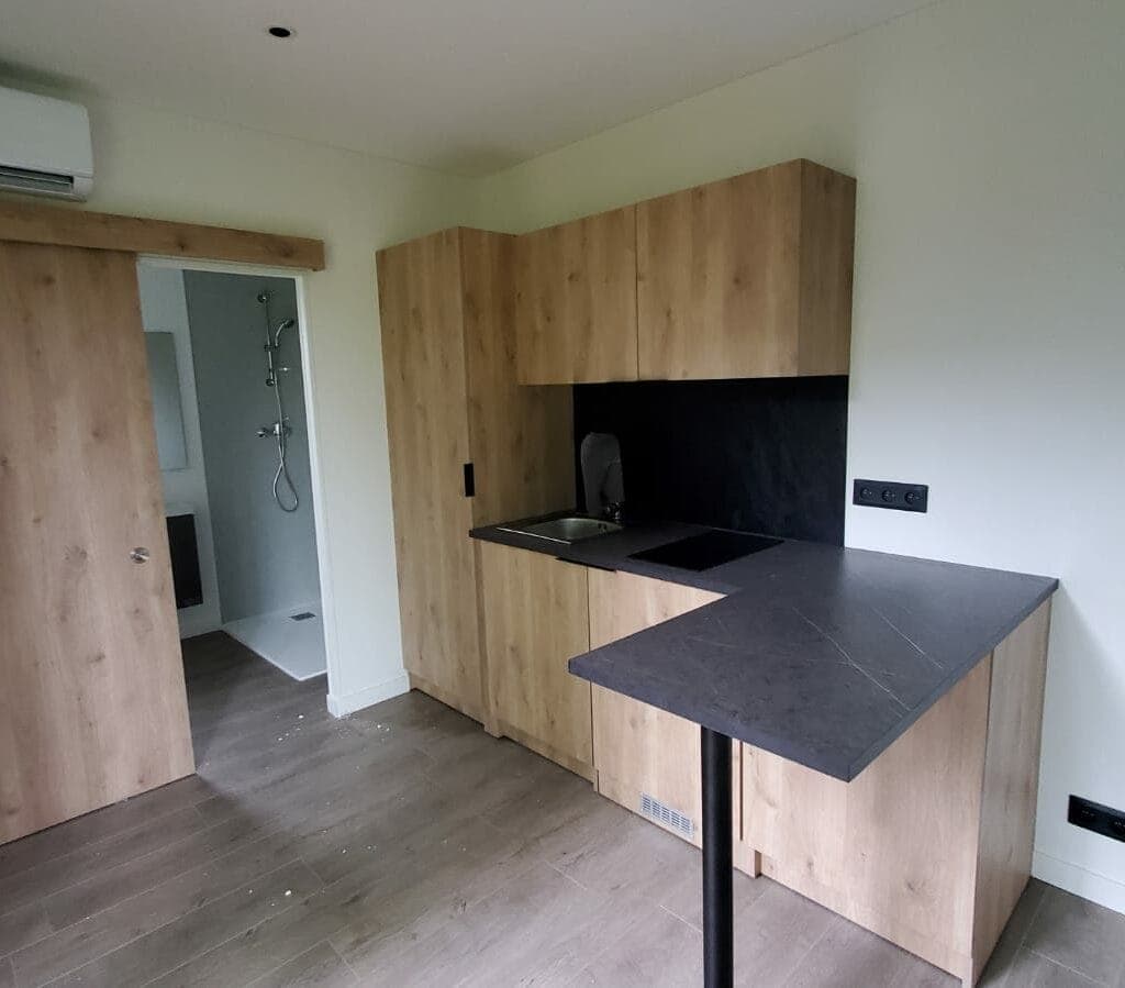 L’intérieur de la Natibox Twin a été aménagé selon les spécifications de notre cliente, créant ainsi un espace qui répond parfaitement à ses besoins. Les finitions intérieures, alliant esthétisme et praticité, ajoutent une touche personnelle à cet espace de vie en plein air.