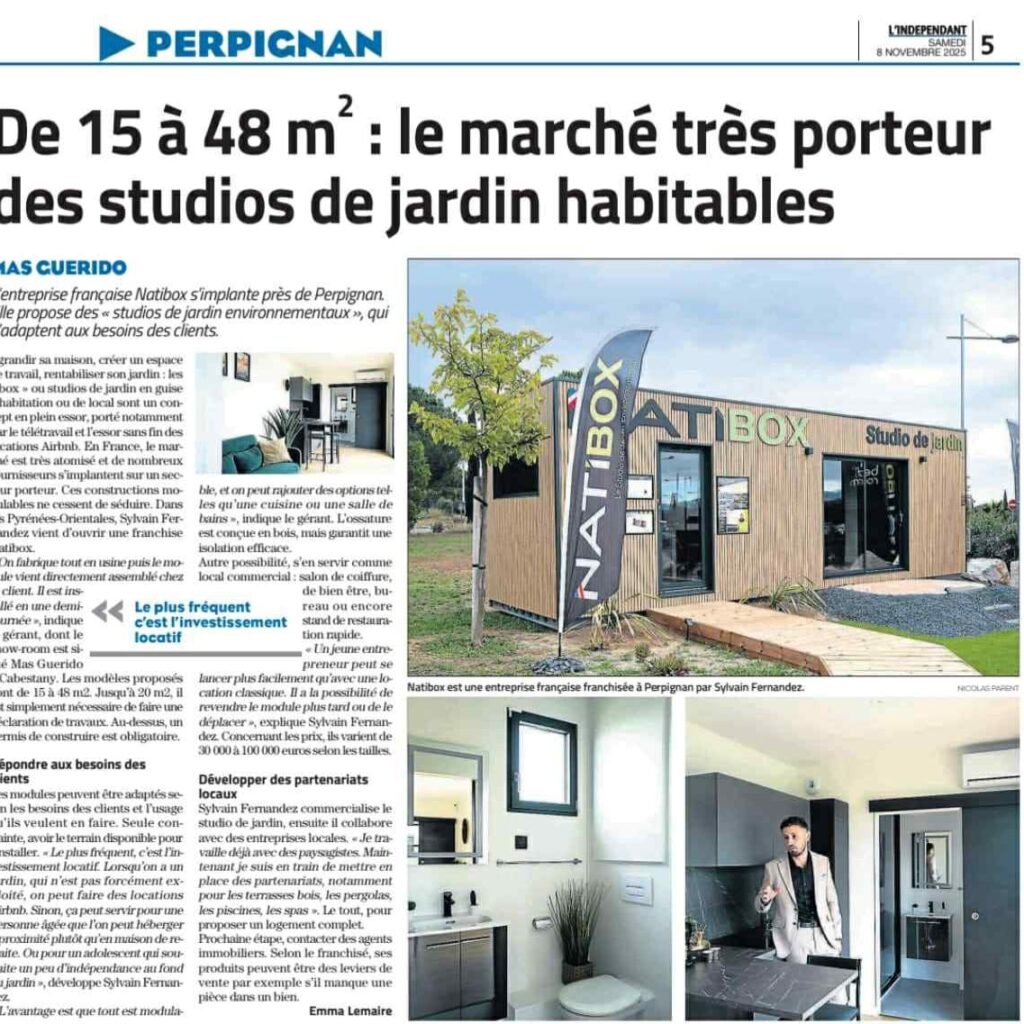 Nous avons le plaisir d’annoncer que Natibox Perpignan, notre concession spécialisée dans les studios de jardin modulaires haut de gamme, a été mise en avant dans L’Indépendant, le journal local le plus lu des Pyrénées-Orientales (66).