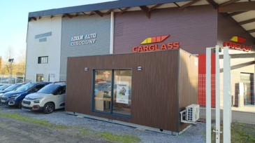 Une Natibox comme bureau d’accueil clients sur le parking d’une concession automobile à Saint-Paul-les-Dax.