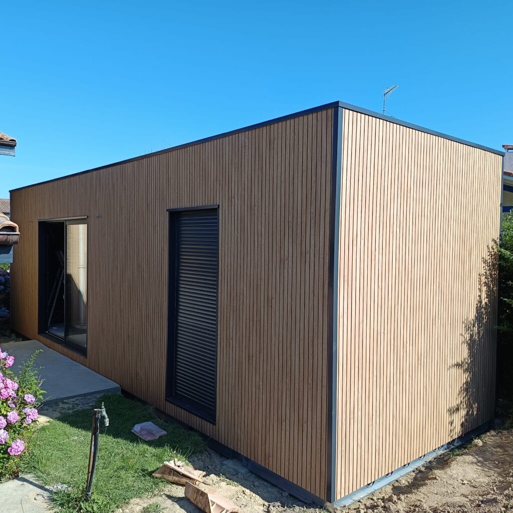 Installation d'un studio de jardin Natibox dans un petit quartier paisible de St-Sever (40). Très bientôt, une véranda viendra faire le lien entre la maison principale et la Natibox, créant ainsi un bel espace connecté et lumineux.